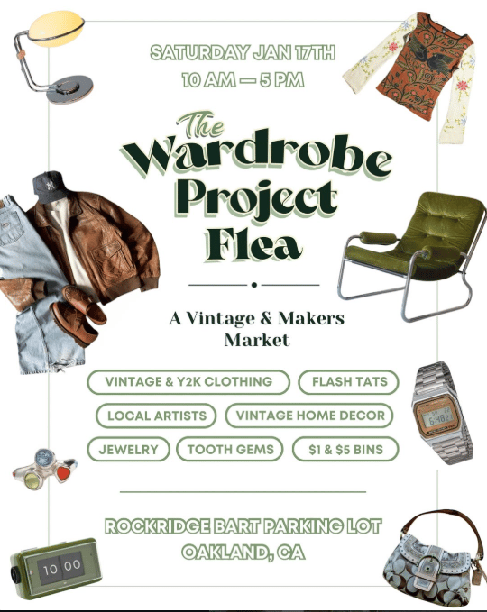 The Wardrobe Project Flea | Sat, Jan 17th | 7 hours | Free📍Rockridge BART Parking Lot – A vintage and makers market with clothing, accessories, furniture, home goods, and jewelry, plus local makers, a photo booth, tooth gems, flash tattoos, and fun $1 bins. All ages welcome with free parking. More info
