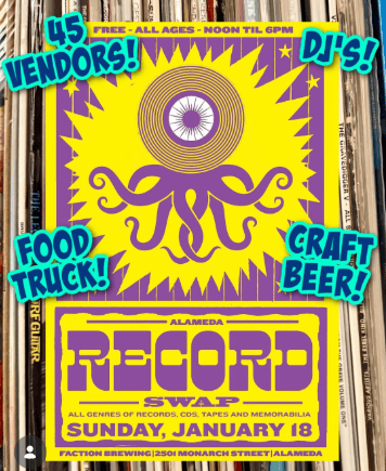 Alameda Record Swap | Sun, Jan 18 | 12 PM – 6 PM | Free 📍Faction Brewing – Enjoy live music from local Bay Area bands on the outdoor patio. You can see the San Francisco skyline while you listen and relax. More info