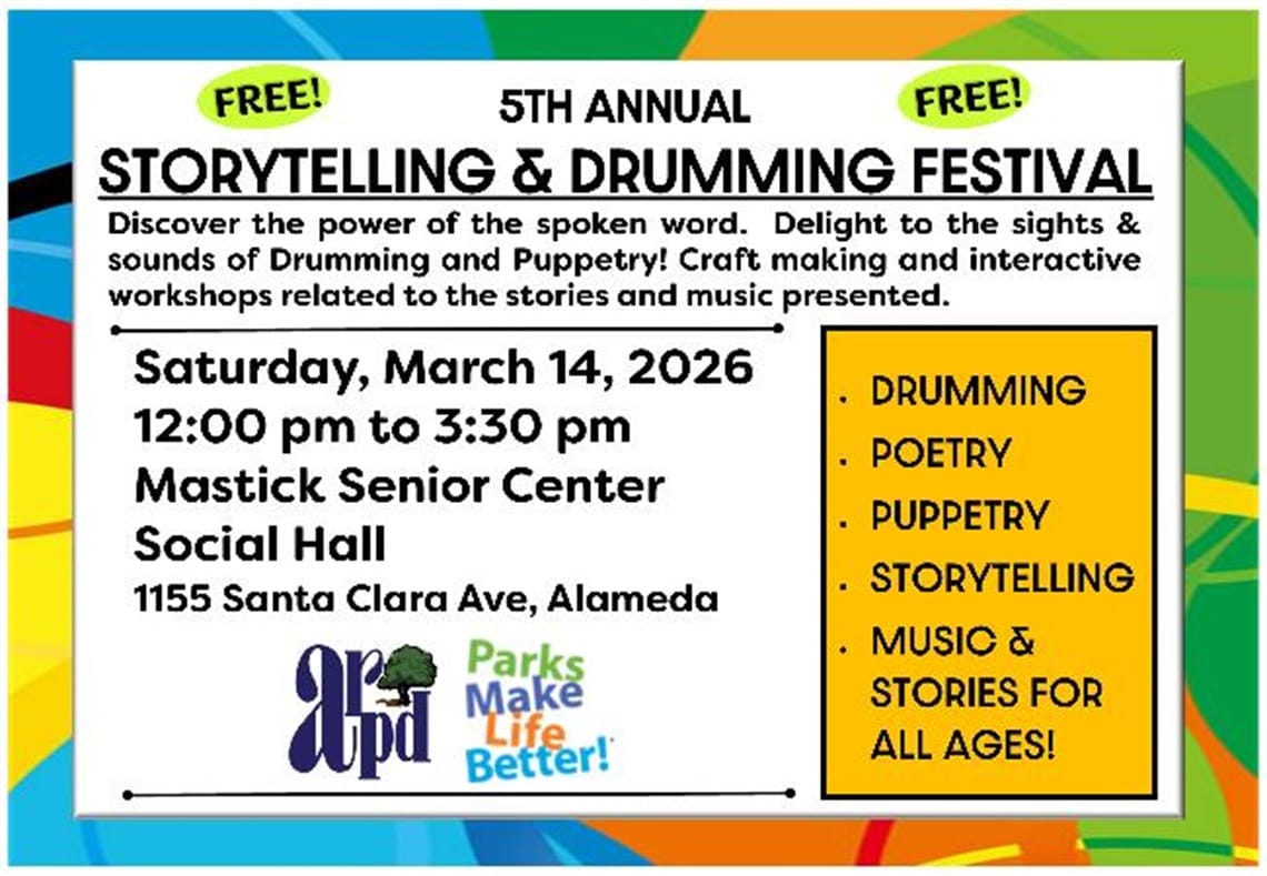 The 5th Annual Storytelling & Drumming Festival is a totally free afternoon of live storytelling, drumming performances, and puppet shows for all ages. Alameda Recreation & Parks puts this on every year and it keeps getting better. Bring the kids, bring the grandparents, everyone is welcome. No tickets needed, just show up. More info